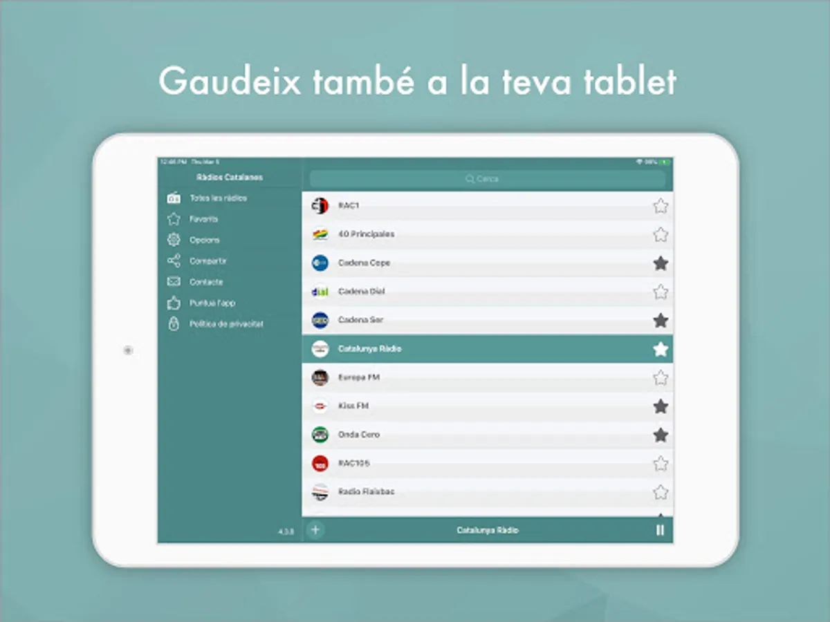 Catalunya Ràdio is an application that broadcasts a good handful of Catalan radios. Enjoy your favorite radios anywhere, anytime.