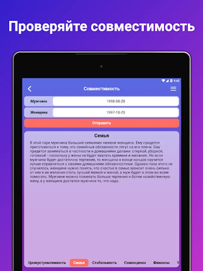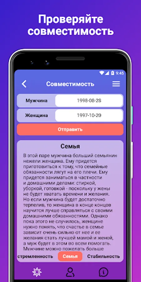✔️ Compatibility with a partner: find out how you fit together and what aspects of your personality fit best. 💕💑