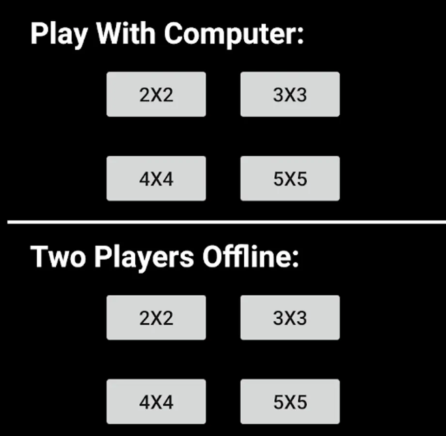 Immerse yourself in the timeless allure of Tic Tac Toe, now reimagined in various board dimensions – from the cozy 2x2 for quick brain-teasing sessions, to the more intricate 5x5 for a strategic challenge like never before. Unleash your inner tactician as you engage in a battle of wits against our advanced AI, honing your skills and exploring new strategies in captivating single-player duels.