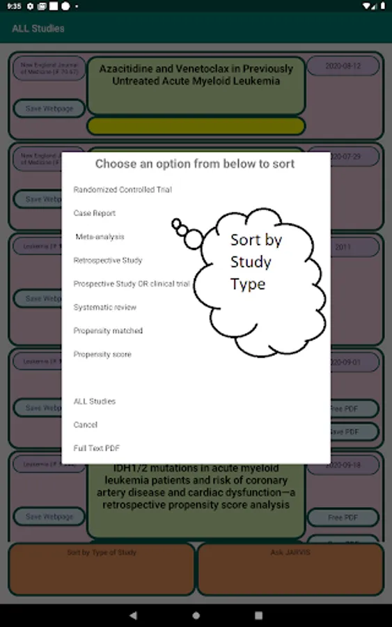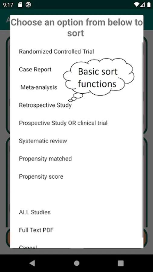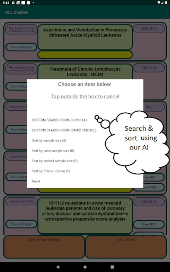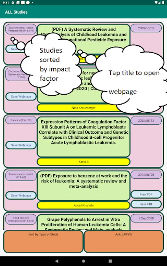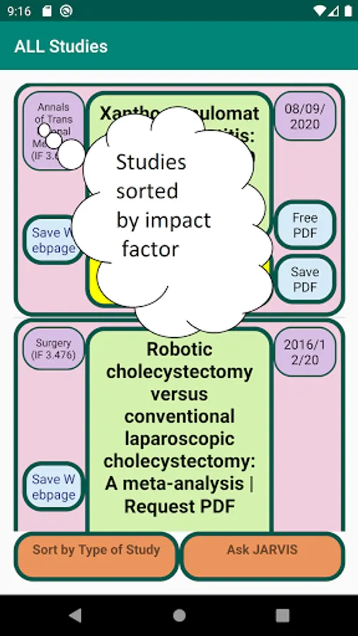 An example would be a search for clinical studies on pancreatic cancer - our app retrieves the most ground breaking randomized studies in NEJM, JAMA etc organized at the top, while Google Scholar retrieves articles not so relevant in the clinical field, or are not as trustworthy. However, searching for pancreatic cancer in the "Basic Science" section in our app would retrieve relevant lab studies at the top. Try this out yourself! You can also organize clinical studies by the type of the study at the push of a button - randomized trial versus systematic reviews for example.