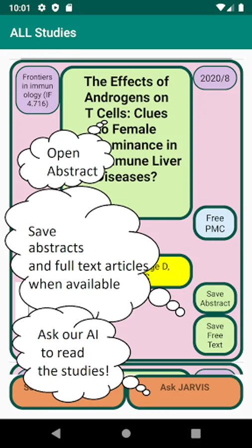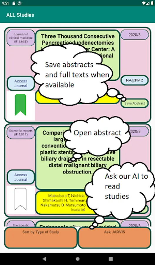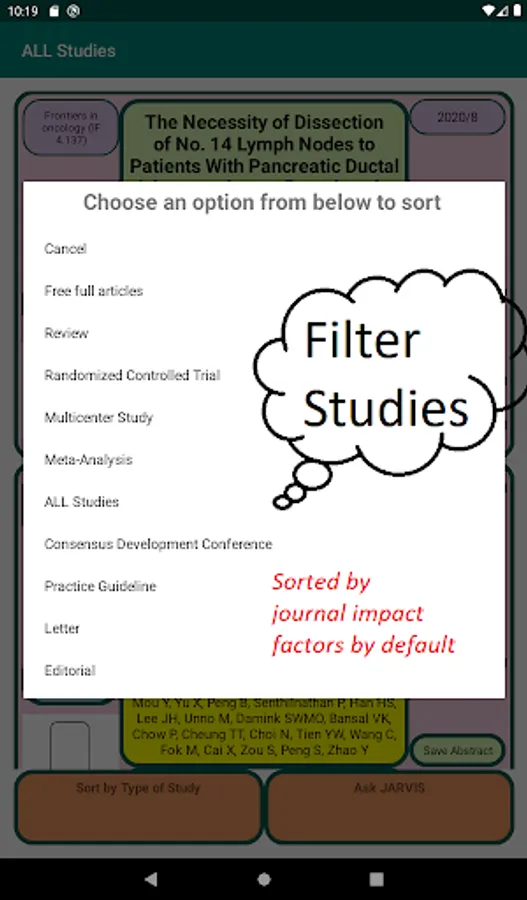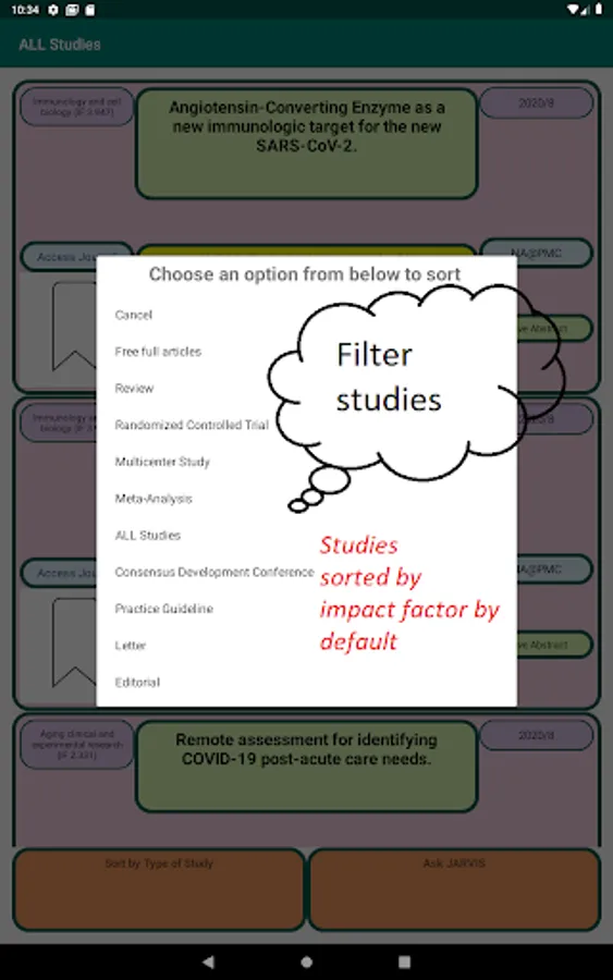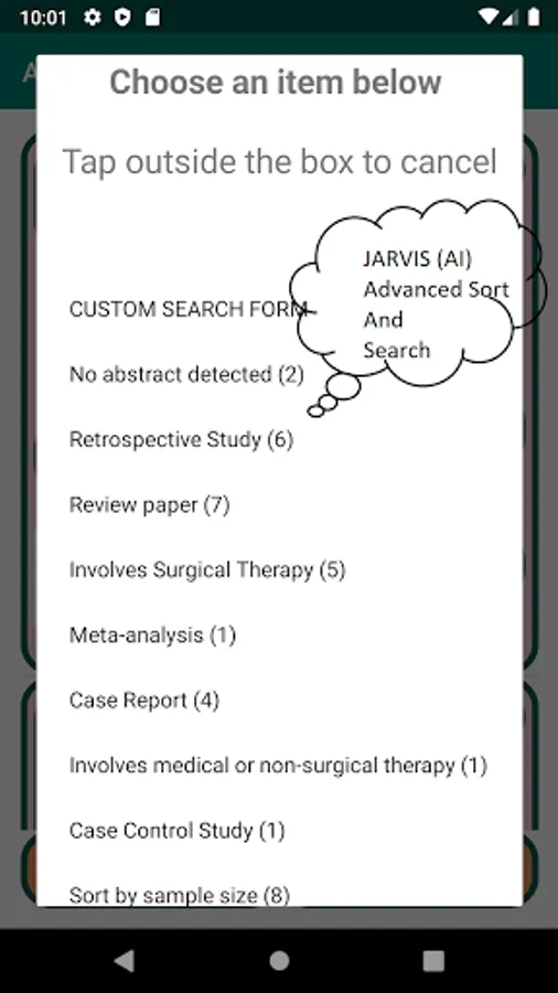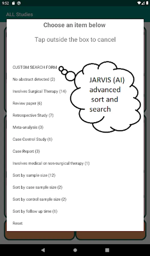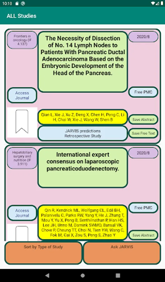2. JARVIS is our home-made artificial intelligence. He can recognize types of studies by directly reading them. He can make your searches and sorts far simpler. JARVIS can recognize whether a study is randomized or retrospective or if it is a review paper, for example. He can also pick out sample sizes of studies and can even identify cases and controls and follow-up period of patients! We felt the need for JARVIS as most studies in Pubmed are not properly classified.