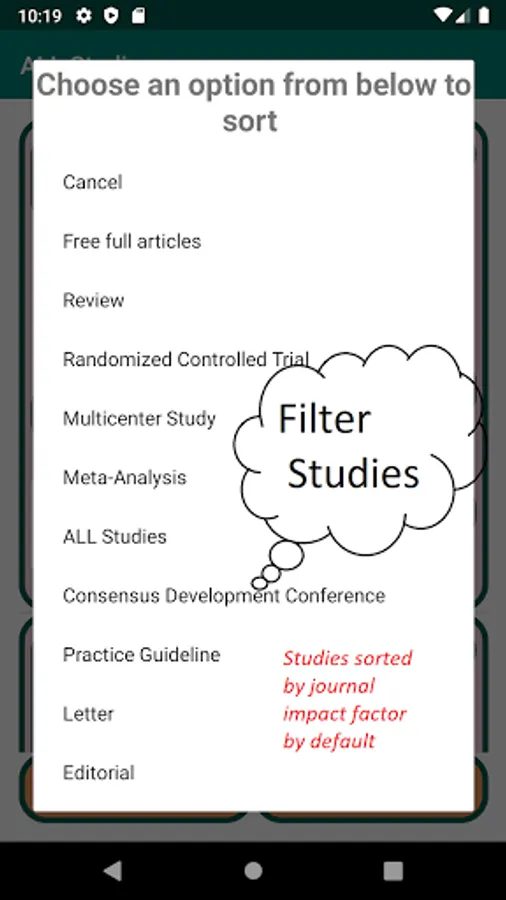 Our app also makes what Pubmed does a lot easier: you can sort by the type of study by the push of a button for example. Bookmarking is also a lot easier. You can also sort by free full text articles to display only articles which are free.