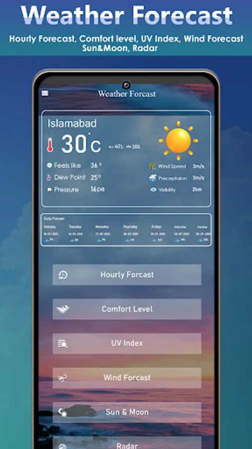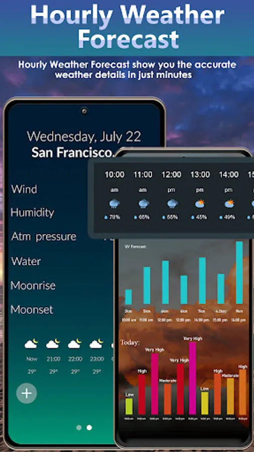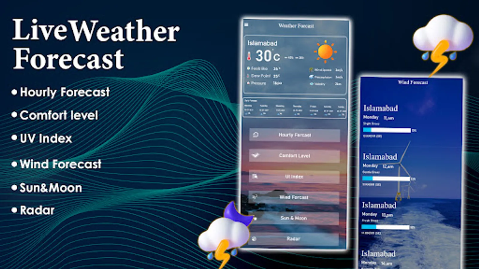 Weather, weather forecast app forecast weather daily and hourly. Live weather forecast is app which gives user brief update climate changes. Contains hourly forecast shows best graph view exact location weather report. comfort level shows dew point weather, humidity weather forecast, cloud and wind visibility index weather app radar shows wind speed and all exact local weather app also. Wind forecast shows graph hourly weather app live, more option in wind forecast shows very cool hourly wind speed with bar indicator. Sun and moonset sun rise, moon set moon rise shows all types and stages of moon with cool weather icons, types of moon, sun rise and set shows in graph, best weather app live is here.Radar module in weather forecast live weather & radar shows humidity, pressure, wind speed weather app, shows temperature and cloud climate check easily. Very cool weather icons and also offered in weather app.interface look cools during dark sky when use weather icons.