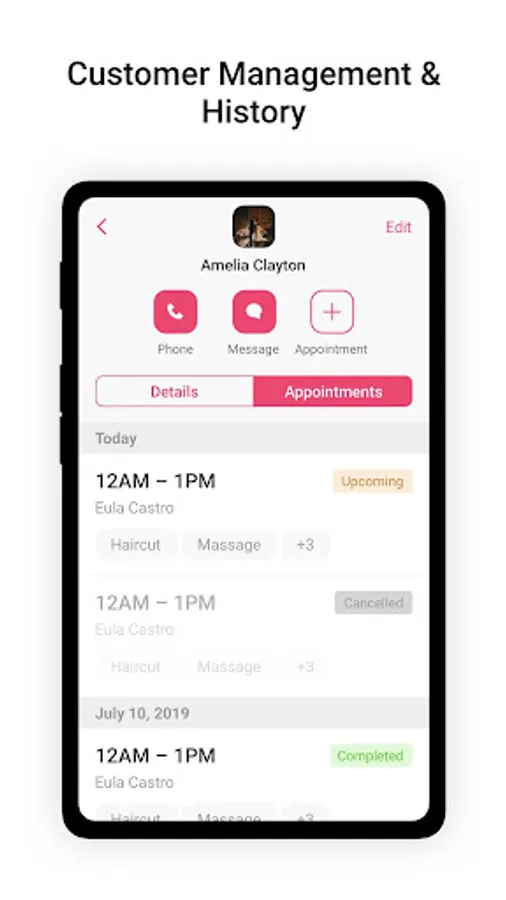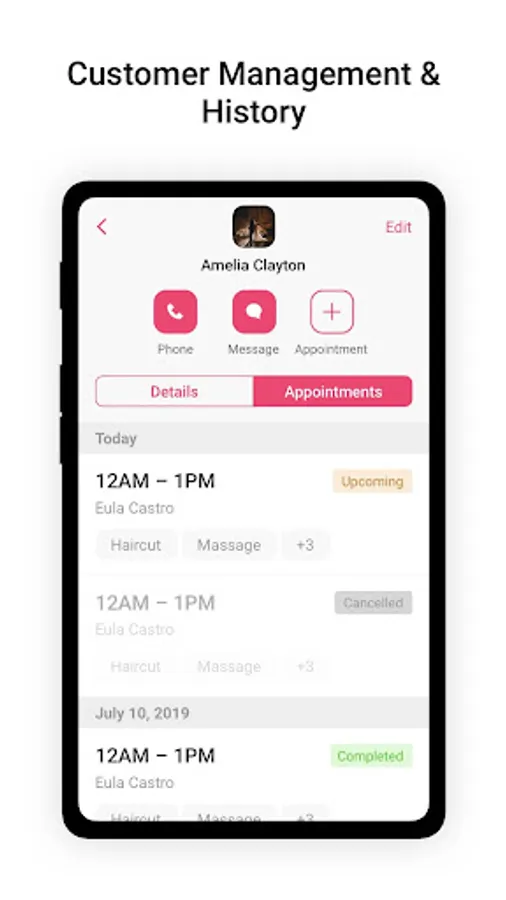 See information about your customer’s such as booking history, upcoming appointmentsб contact information, date of birth and other.