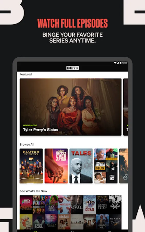 Use the BET NOW app to watch exclusive content and livestream BET shows. Catch the latest episodes of your favorite TV series, like Tyler Perry's Sistas, Tyler Perry's House of Payne, The Breakfast Club and BET News specials. Get Notifications for new episodes and other updates on the go.