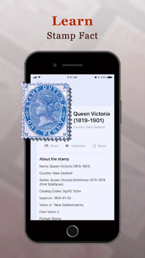 The identification process is simple! All you have to do is take a quick photo of your stamp or stamp (or upload it from your phone storage). Then crop your photo with simple editing tools to maximize clarity and accuracy. From there, the app will match your stamp or stamp to information in the extensive database.
