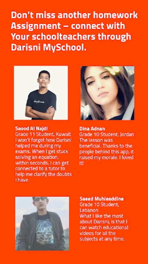 Over 160,000 students across the Middle East trust Darisni to get their classroom challenges solved every day. The personalized and convenient service is supported by a world class operating infrastructure, experienced tutors and instructors, and at affordable prices. Our tutors go through a tough and challenging approval process that ensure our students get only the best suggestions and answers that keeps problem solving at its core.