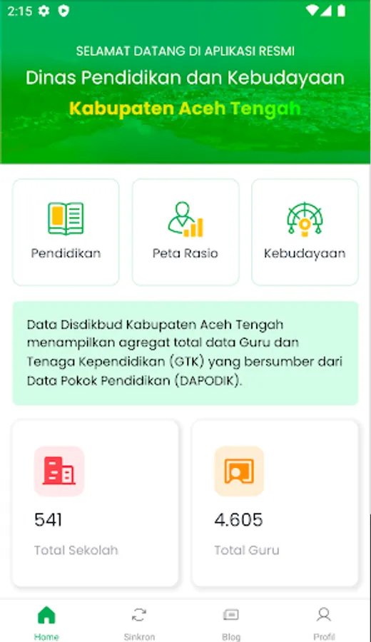 Data from the Department of Education and Culture (DISDIKBUD) of Central Aceh Regency displays the aggregated total data on Teachers and Education Personnel (GTK) sourced from the Basic Education Data (DAPODIK). DAPODIK is an online education data collection system for managing national education data which includes education units, students, teachers and education personnel carried out by the main unit (PAUDNI, DIKDAS, DIKMEN, etc.).