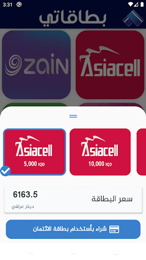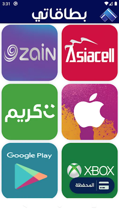 تطبيق بطاقاتي يمكنكم من تعبئة رصيد الهاتف زين العراق، اسياسيل وكورك وشراء البطاقات الالكترونية كوكل بلي بوبجي ايتونز وغيرها.