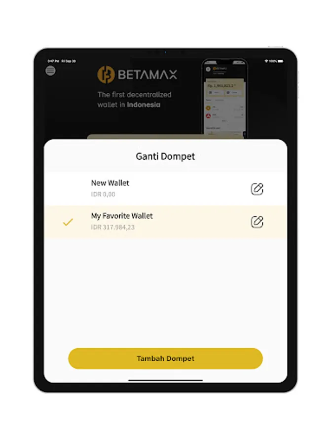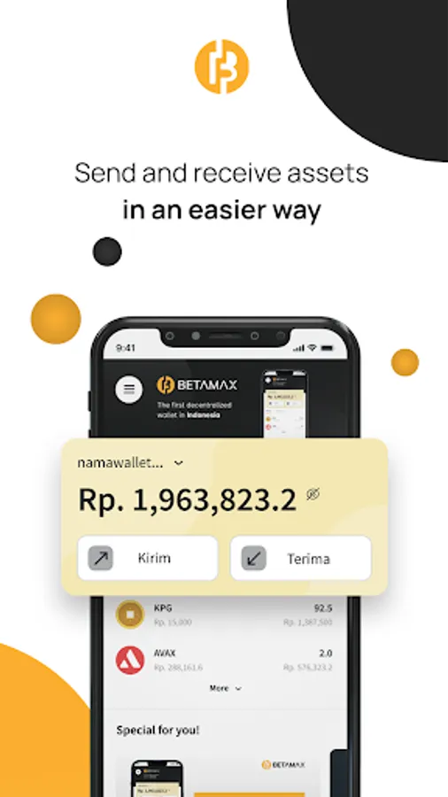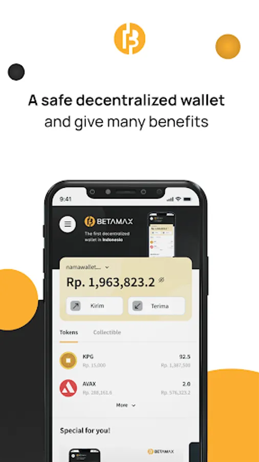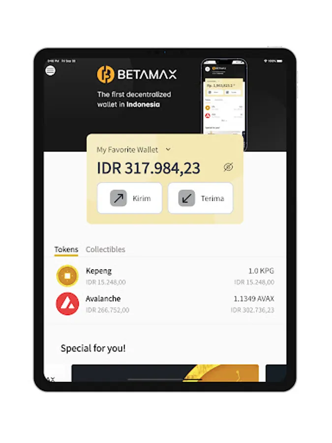 Betamax adalah dompet resmi dari Kepeng Indonesia. Anda dapat membeli, menjual, mengirim, dan menerima KPG secara cepat, mudah, dan aman. Anda juga dapat mengelola aset NFT yang anda miliki pada berbagai ekosistem Kepeng langsung di Betamax, seperti Baliola dan Benih.