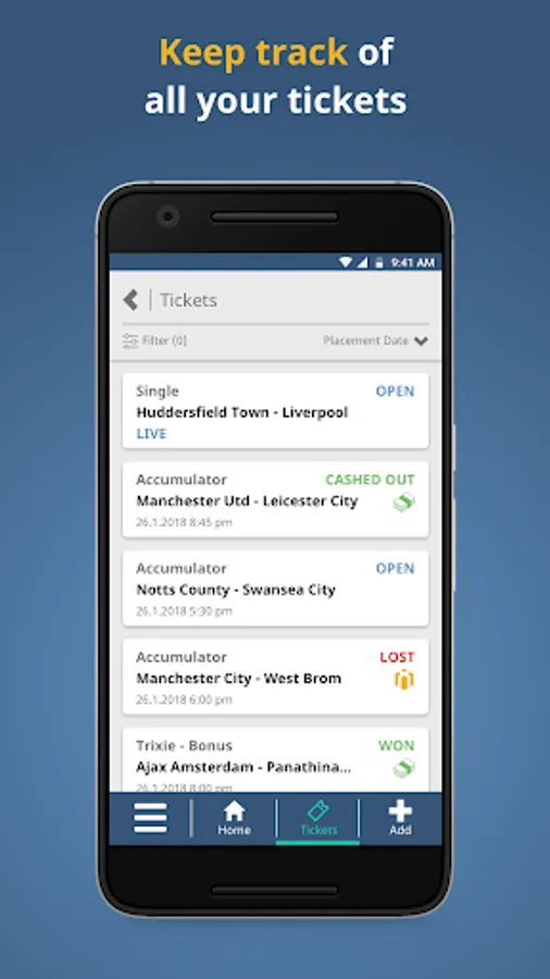 Check your tickets status anytime on-the-go, watch the live match flow to follow in-play events in real time or cash out early if your bet turns against you.