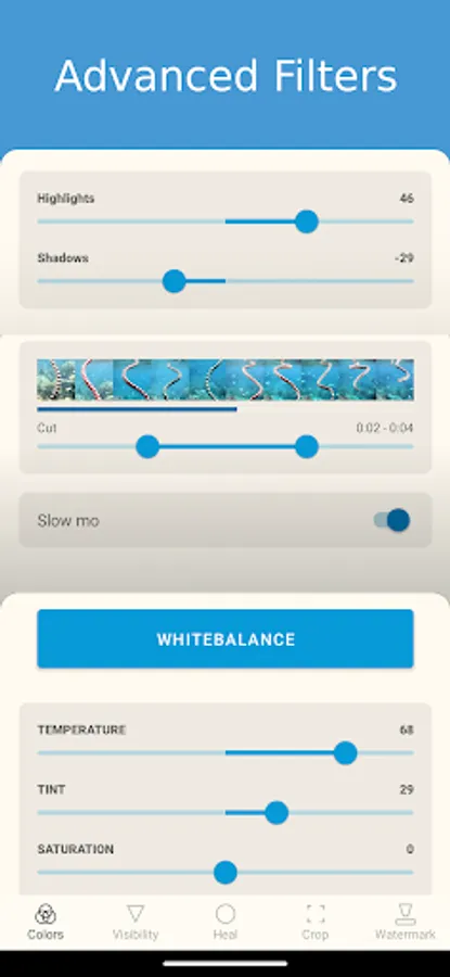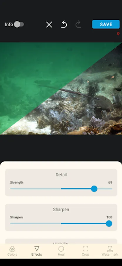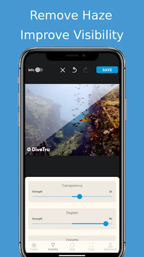 Removes blue and green haze, recovers the missing colors, increases detail and makes your photos and videos look professional.