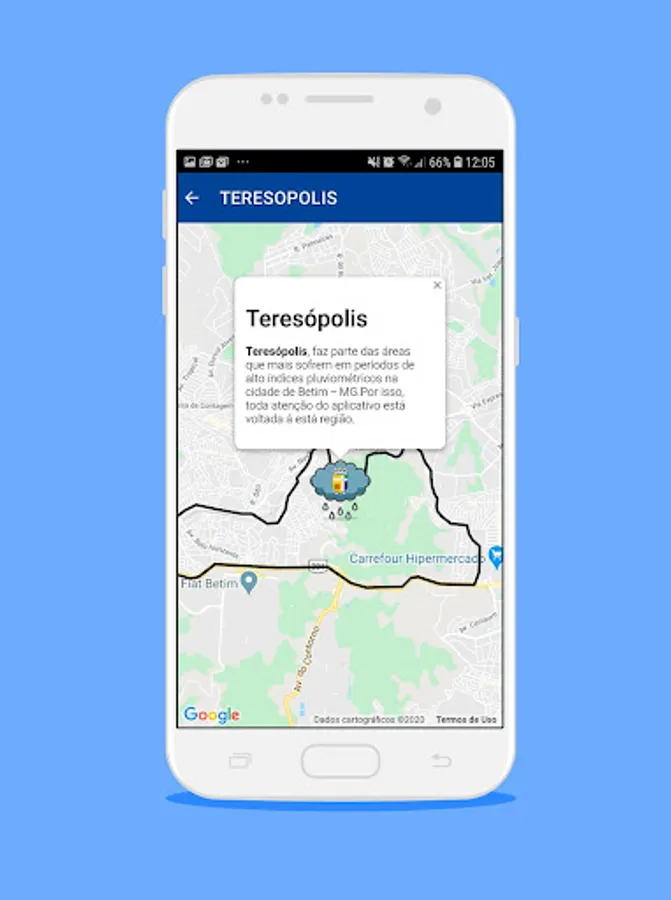 The application has a mapping of all risk areas in the municipality of Betim, as well as issuing alerts during the rainy season; making landslide risk zones as well as flooding areas aware; The Application also provides emergency service phones for speed dialing, services that are so requested in these periods, such as Civil Defense, SAMU, Firefighters and Cemig; and not only will it serve for alerts, but it also has a tab dedicated to raising awareness, passing on general information and knowledge of the basic rights of the citizen ...