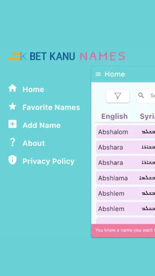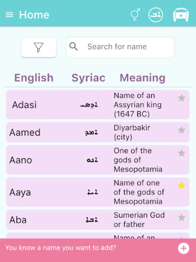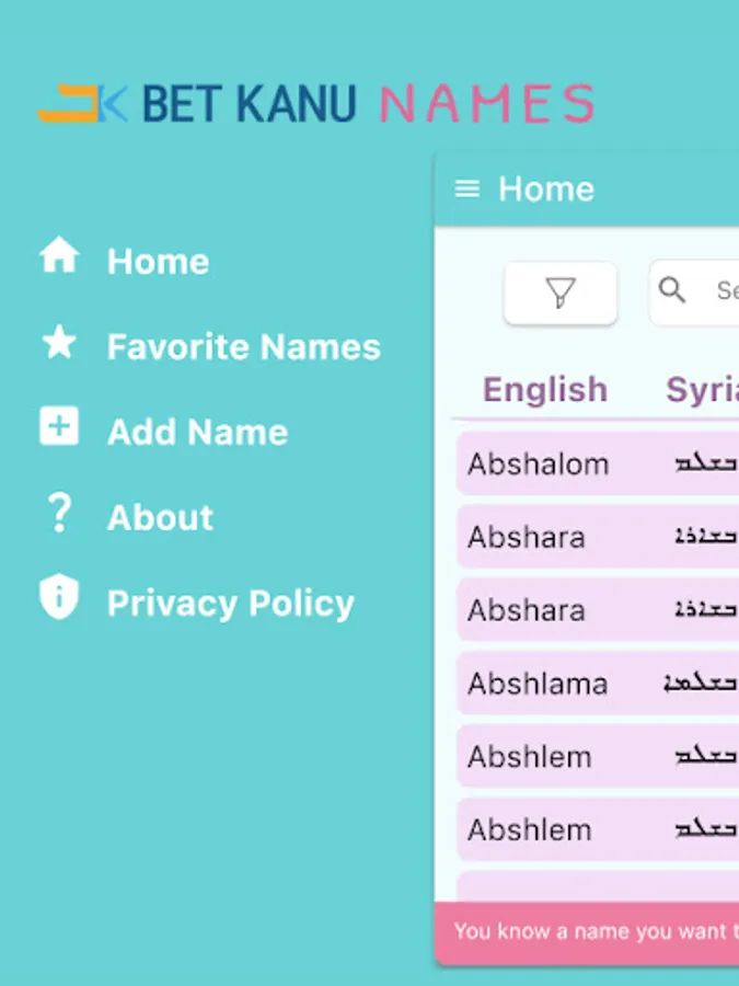 BET KANU Names App is the best place to find a unique Syriac name for your newborn. Whether you prefer religious names, cultural names, short names, compound names, or even historical names using ancient Assyrian, Akkadian, and Sumerian names, BET KANU Names is the solution for you.