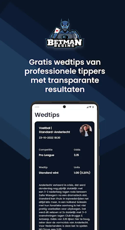Volg gratis de tips waar je op kan wedden van het Betman-team. Alle resultaten worden transparant bijgehouden en zijn op elk moment in te kijken. Via de Betmanbegins-app kan je ook de boosted odds en promoties bekijken waar jij van kan genieten.
