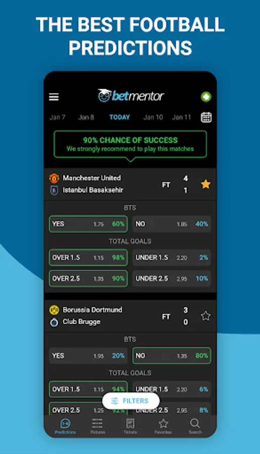 is an app that offers several tools to help you to get football predictions increase your success rate at Social Betting Casino!We provide accurate daily football betting tips and football predictions with extended statistics for each match elaborated by an artificial intelligence algorithm constantly evolving.