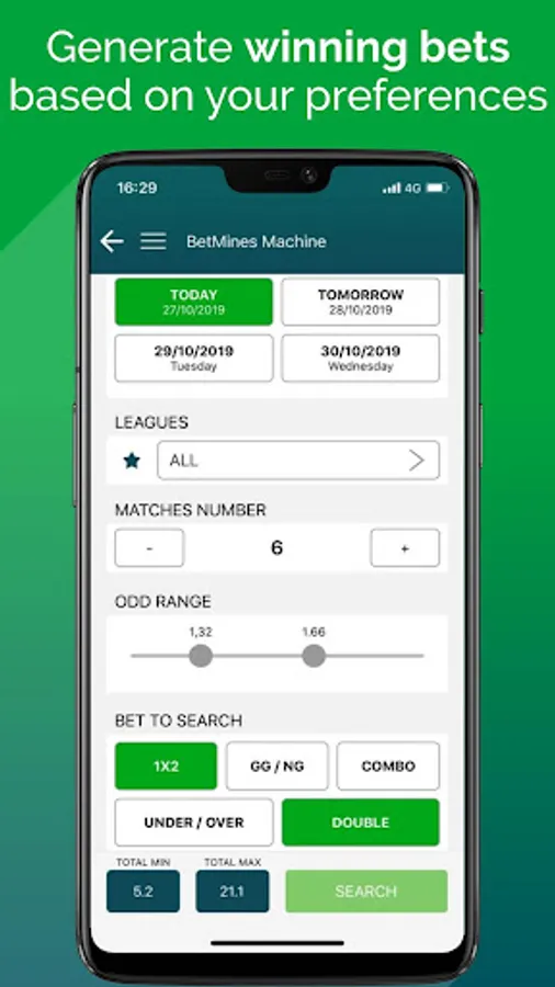 You choose the leagues you want to bet on, the type of event (1X2, double chance, under/over , combo and both team to score), the desired odds range, the number of matches and BetMines will generate for you the most likely bet based on the criteria you have chosen.