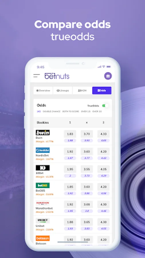 TrueOdds presented on BetNuts is based on a "Margin Proportional to Odds" algo that is able to expose the underlying margin of the bookie in question and present users with Wisdom of the Crowd, i.e. without margin baked in. Finding disparities between market odds and TrueOdds may expose value bets - where you have an edge.