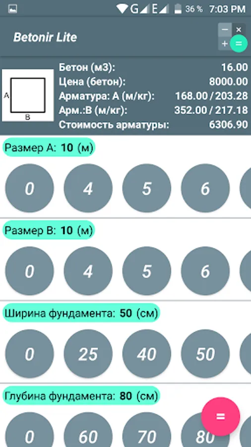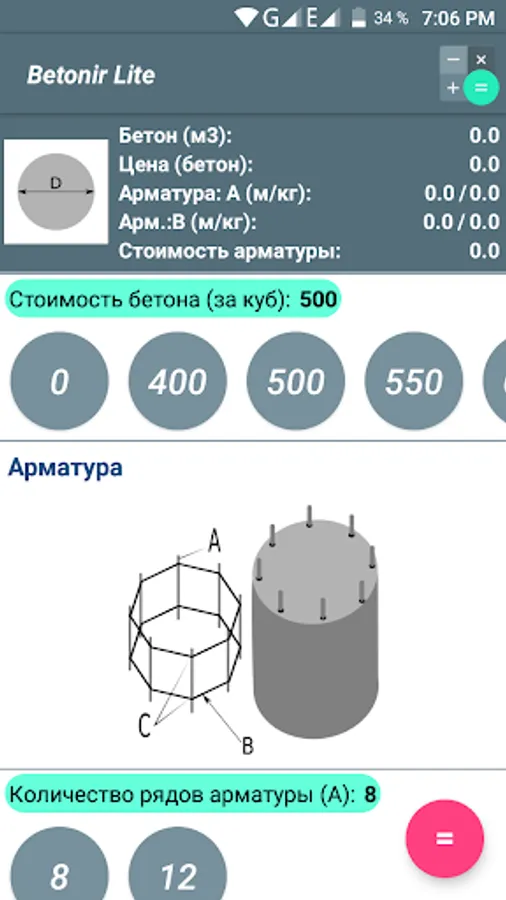 This app allows you to quickly calculate the number of concrete and reinforcement for your basement or other structure