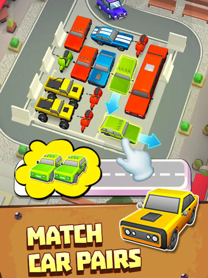 🚙 LOOK for identical cars to match pairs and complete level objectives.