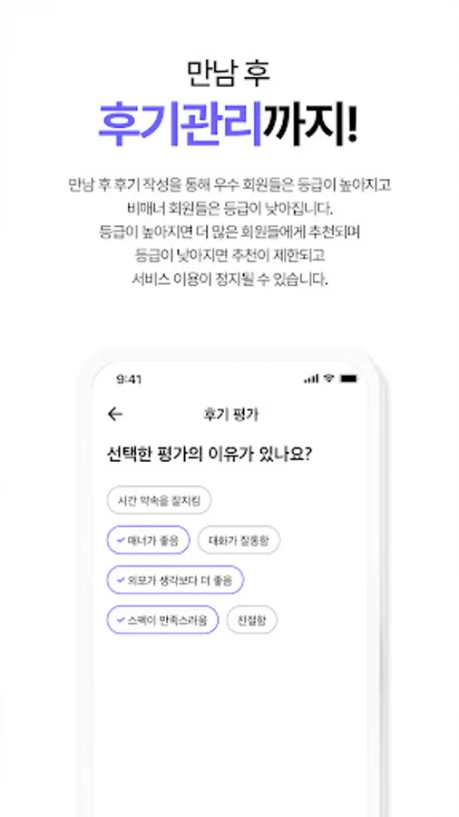 By writing a review after meeting, excellent members get a higher rating and bad members get a lower rating. Higher ratings are recommended to more members, and lower ratings may limit referrals and suspend service use.