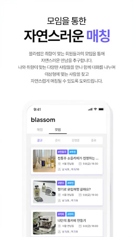 Blossom pursues natural encounters through gatherings with members who match their tastes. We help you meet and chat with various people who match your taste, find someone who fits your ideal type, and match naturally.