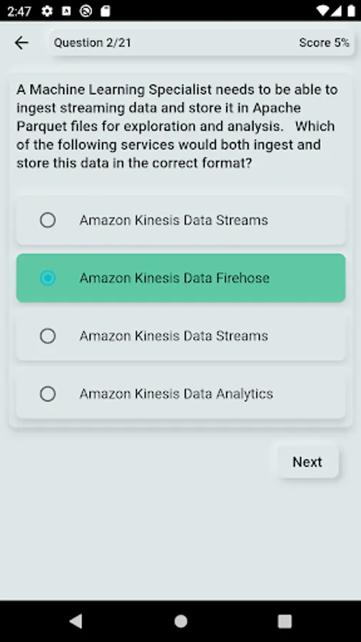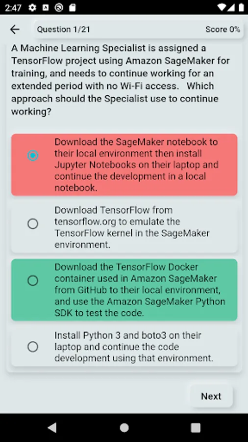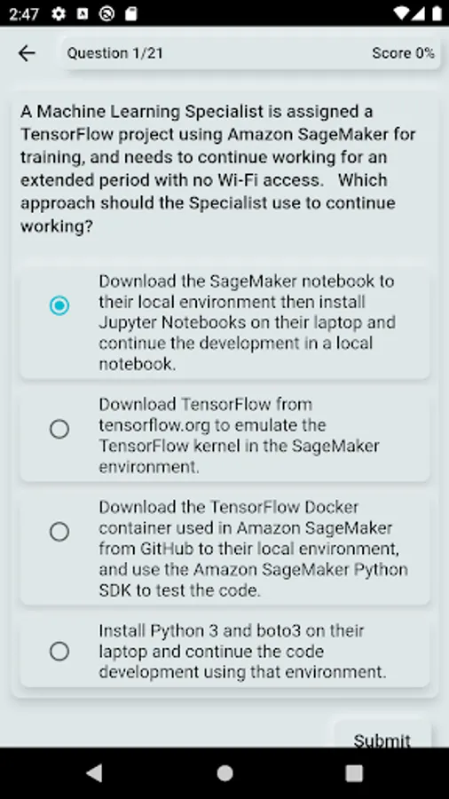 The app provides sample AWS Machine Learning Specialty Exam questions with answers. It has more than 185 multiple choice and multi select questions.