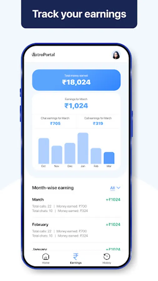 At AstroZodiac, we believe in transparency! You can see the total money earned as well as month-wise earnings with details like the total number of calls and the amount of money earned from those respective calls in a month.
