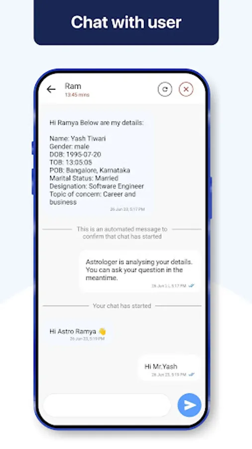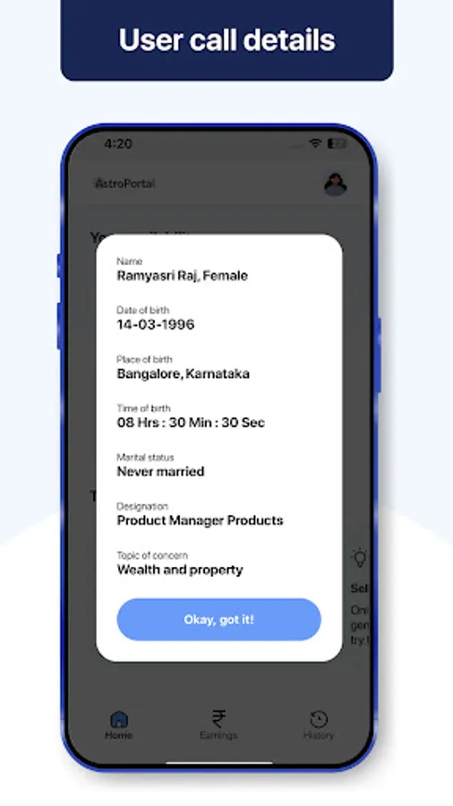 On the AstroPortal app, whenever a user will call you, you will see their details like name, DOB, place of birth, marital status, and topic of concern. It will help you resolve their problems in a better way.