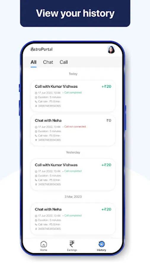 You can also check the complete history of your calls with users in the ‘History’ section of the AstroPortal app. So, you can see all details like call duration, name of the user, date and time of the call.
