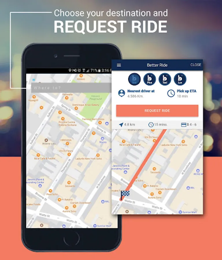 • Getting Started: After downloading Better Ride and signing up, simply open the app choose your car category and request a ride. for your accurate pick up location our app uses your current location, you will also have detailed information of your driver including picture, car type, plate number when a driver accepts your request, you have control to message and call your driver through the app instantly.