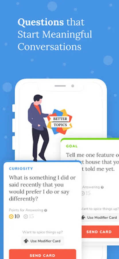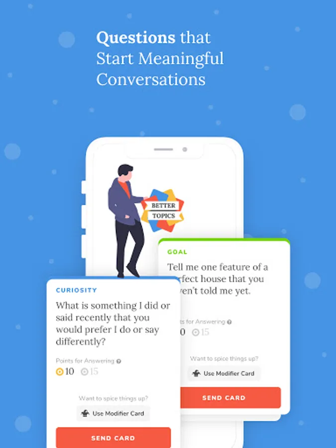 Not a single Better Topics question card creates a “one and done” type of conversation. Just as people change over time, so do our answers, preferences and wants. We created our game so that the subjects are relevant every time you approach them.