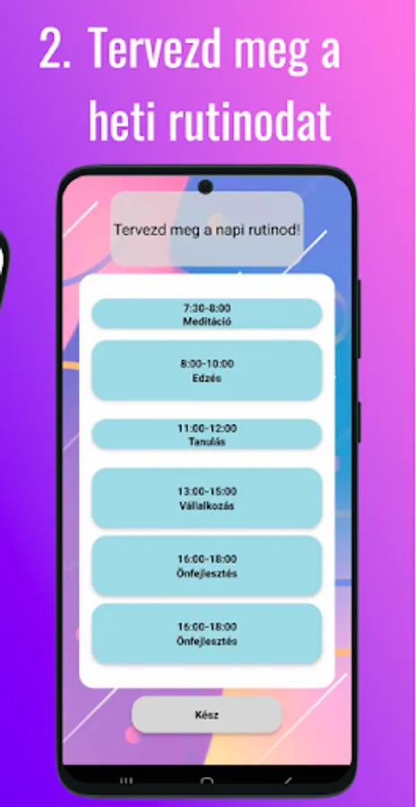 Az alkalmazásban a legsikeresebb emberek szokásait tudod átvenni, és hosszú távon meg is tartani őket. Köszönhetően a beépített szokástervező modulnak, amivel előre fel tudod tervezni hogy mikor küldjön neked értesítést az alkalmazás egy-egy szokás elkezdésénél.