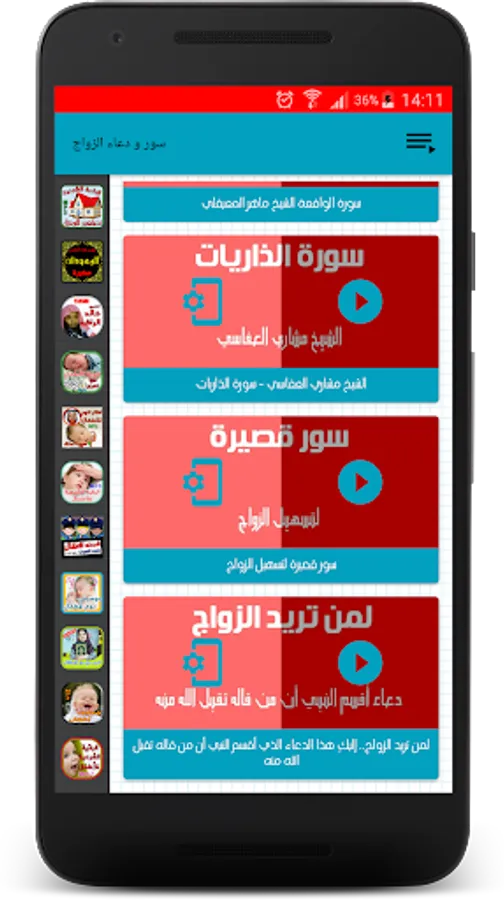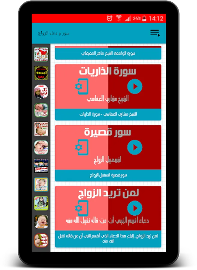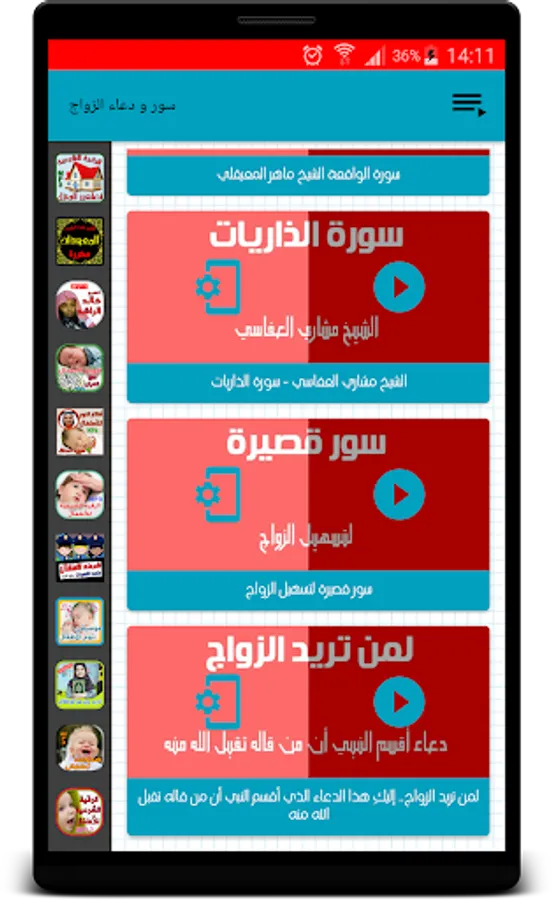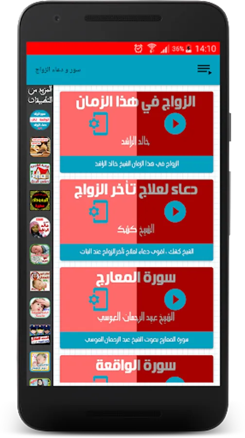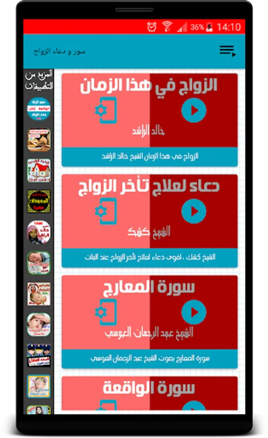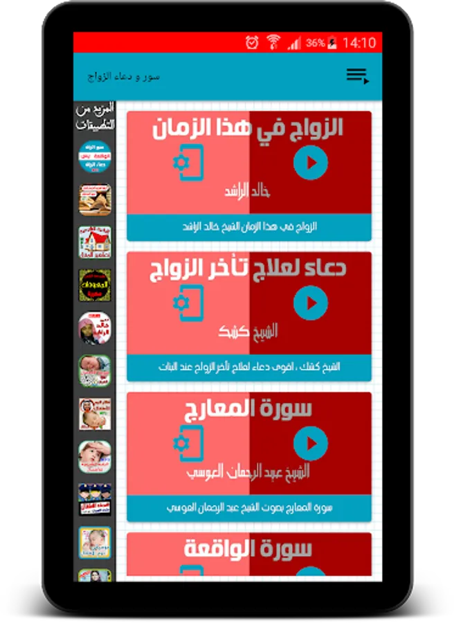 The application of the wall of marriage and the supplication to accelerate the marriage is an audio reading of Surat Al-Maarij, Surat Al-Waqi’ah, Surat Al-Dhiyarat, and Short Surahs to facilitate marriage, and prayers to accelerate marriage and a prayer to treat late marriage and prayers to facilitate marriage.