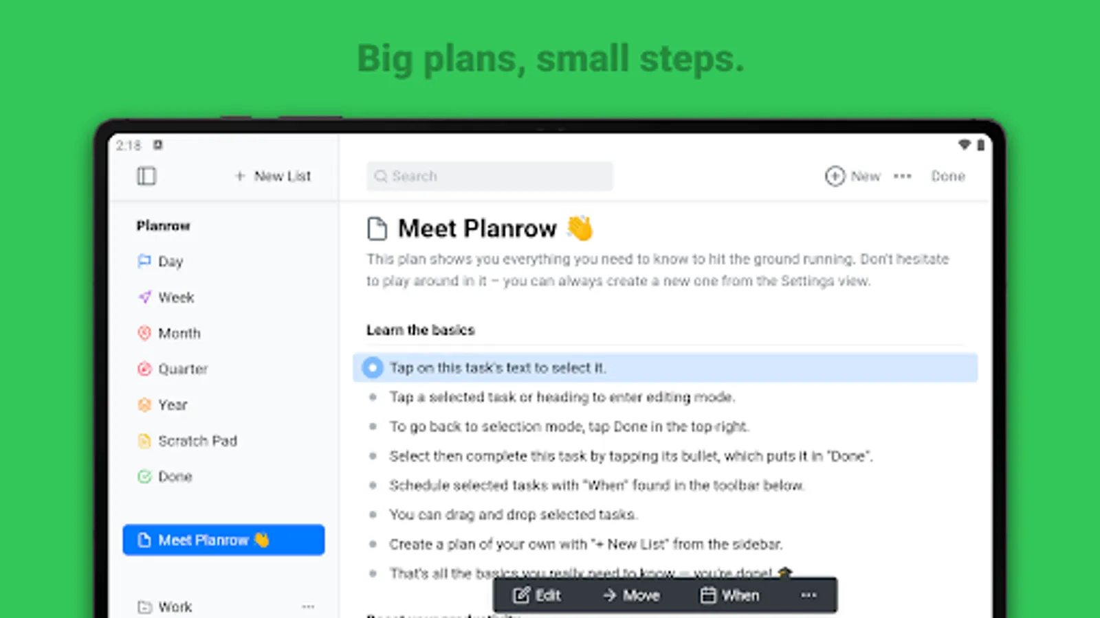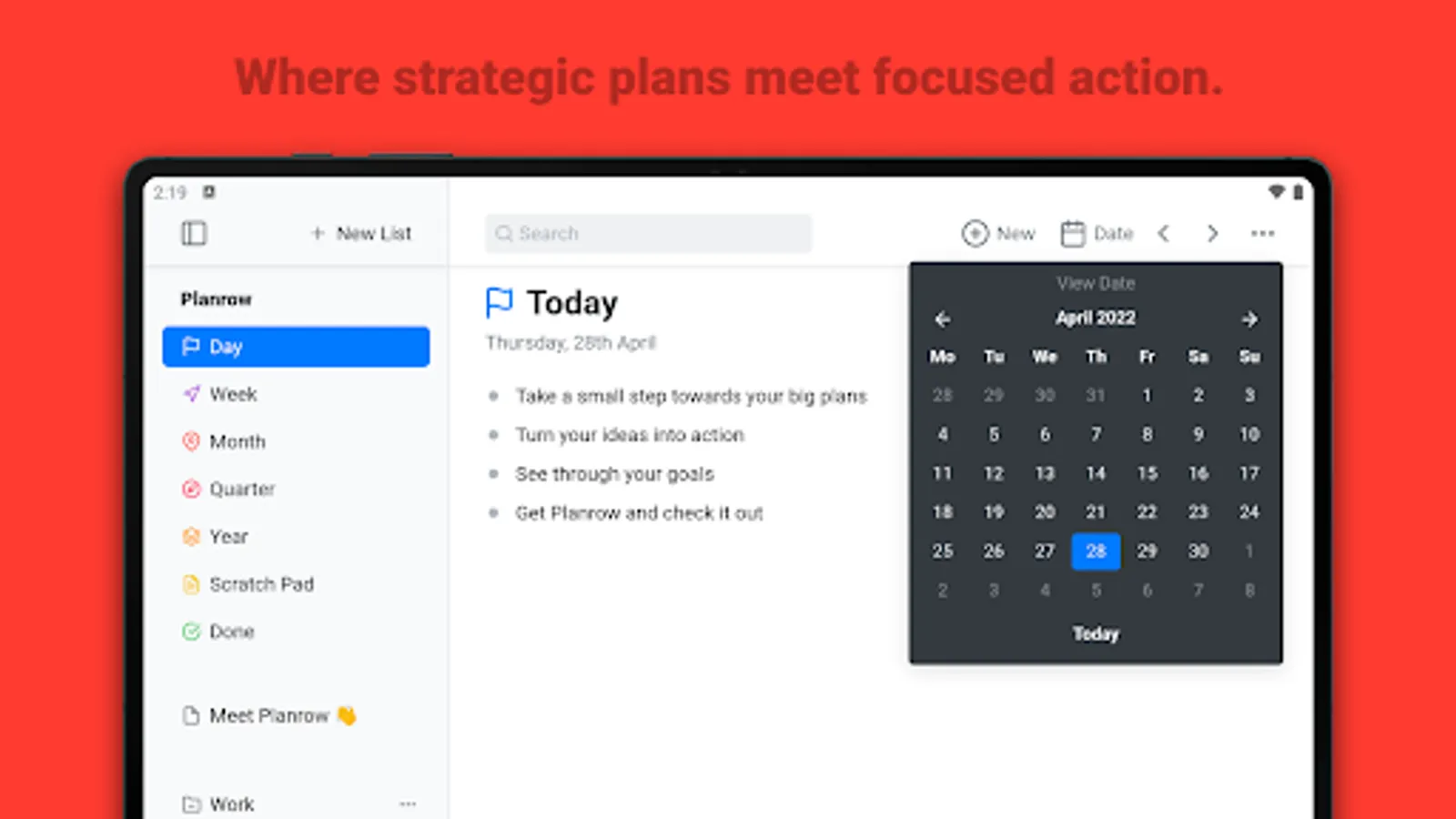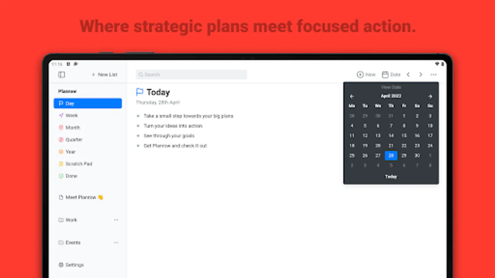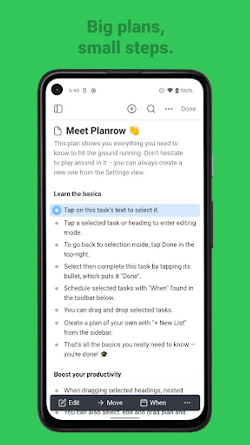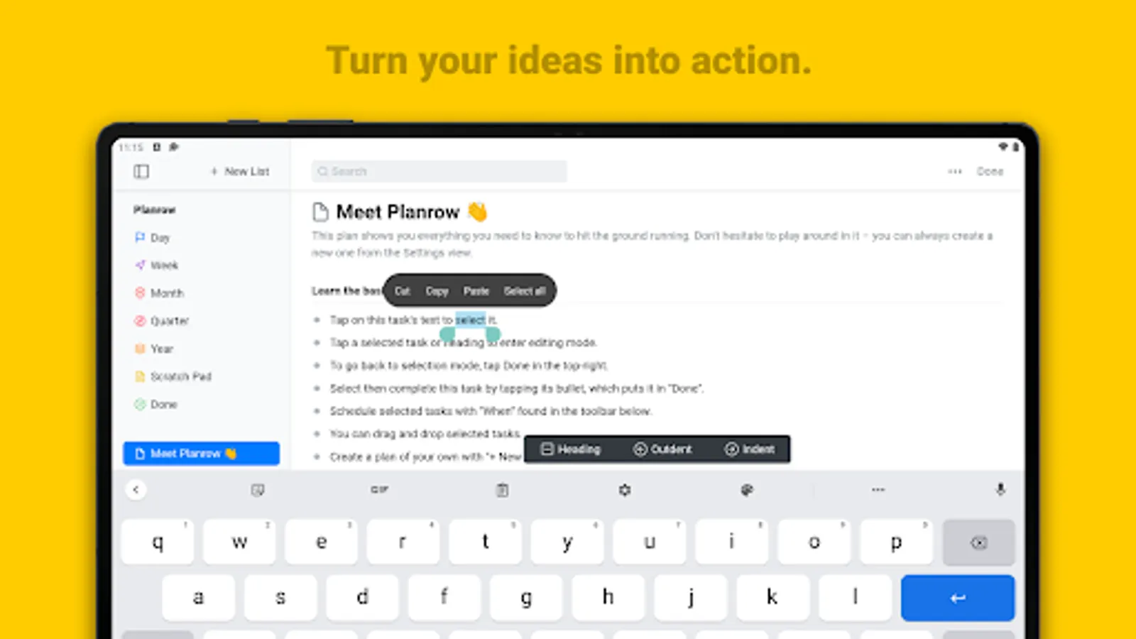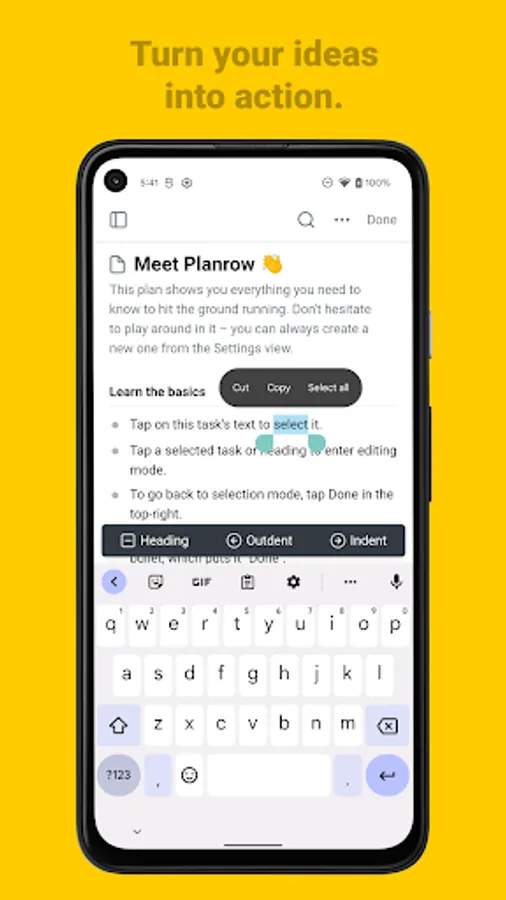 By bringing together your long-term notes and present-term tasks, Planrow helps you plan your time from a place of comprehensive thinking. This helps you take action on what's critical, for consistent, intentional execution.
