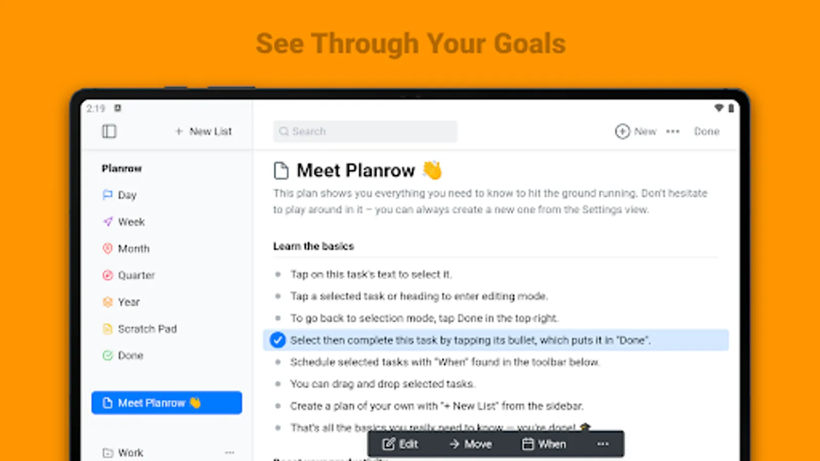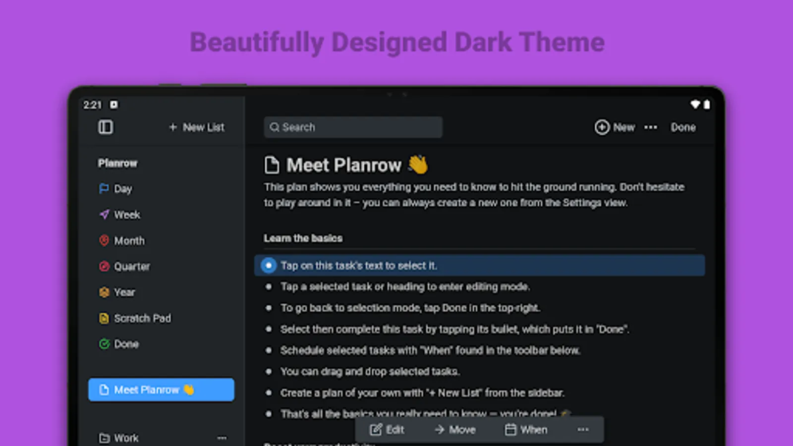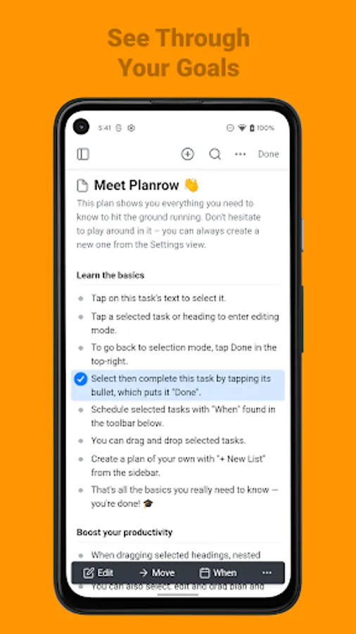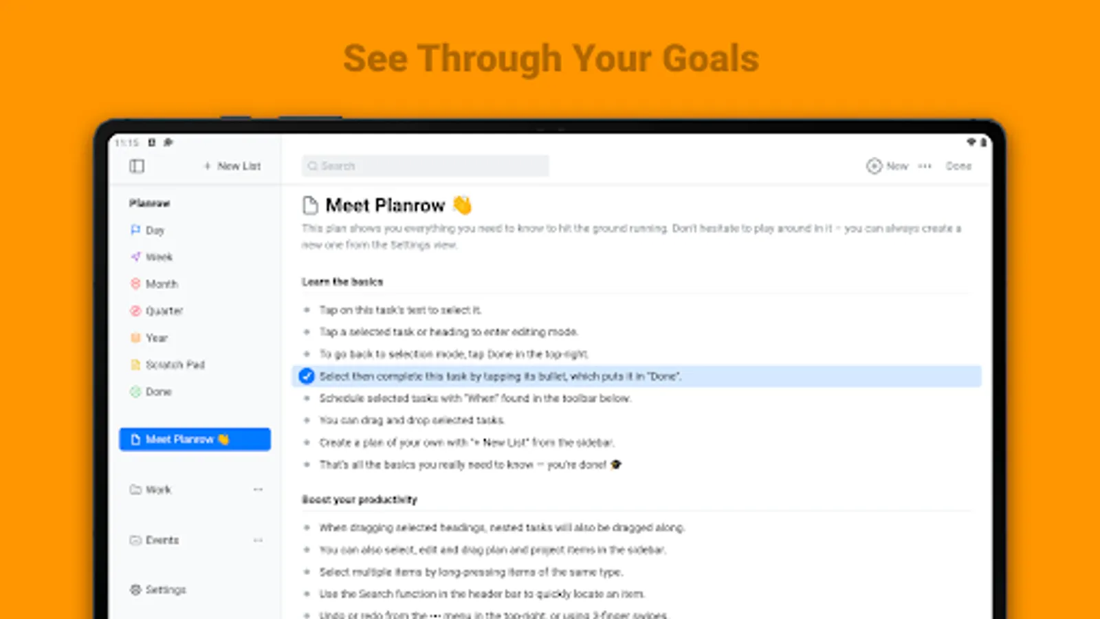 The app's user interface designed to be simple, which allows it to abstract away into the background and so you can fully focus on your work. But under the hood, there's more to Planrow than meets the eye, with features like: