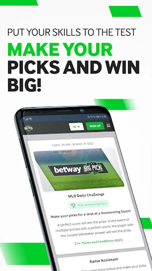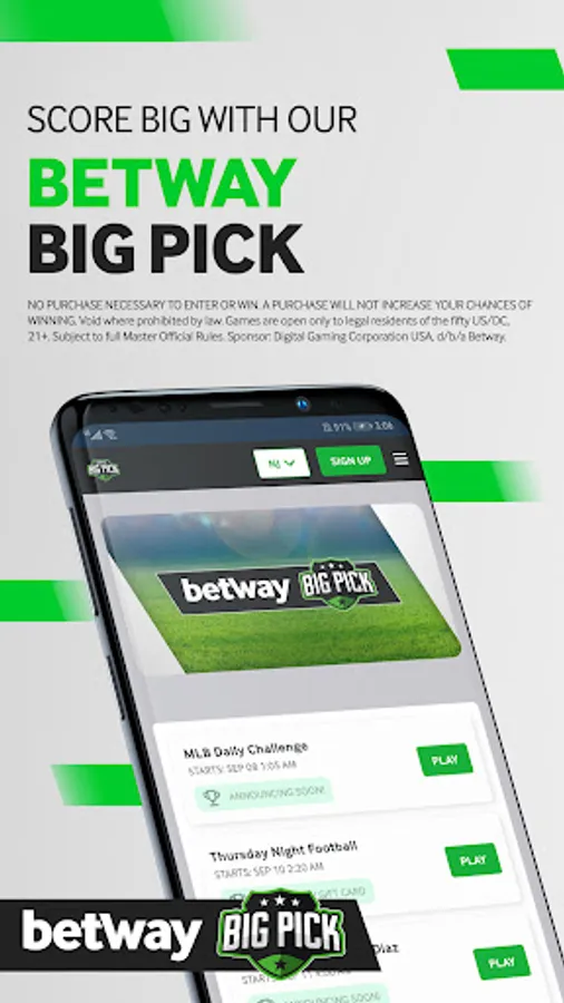 Betway Big Pick app is a free-to-play pick-'em competition game where your winning selections can give you a chance to earn you cash prizes. Draft your team from all your favorite sports including: NFL, MLB, & NBA!