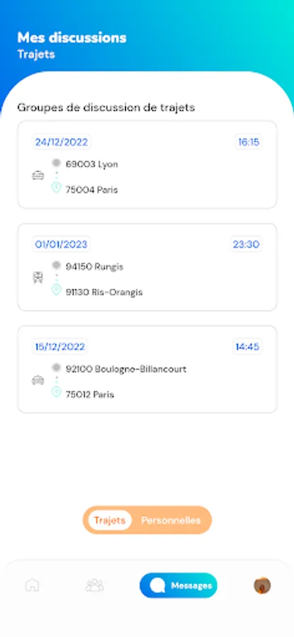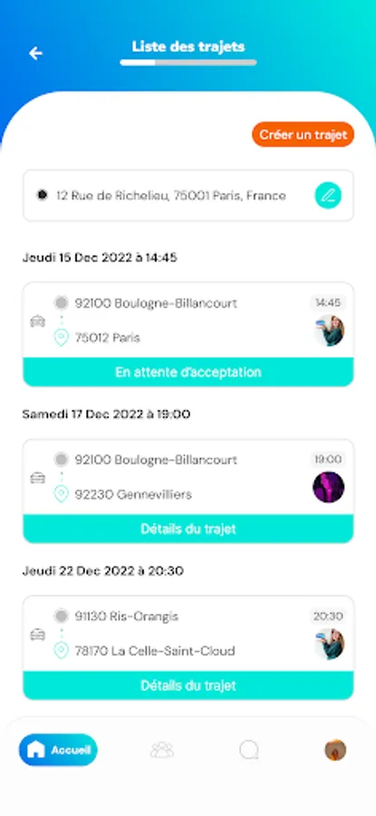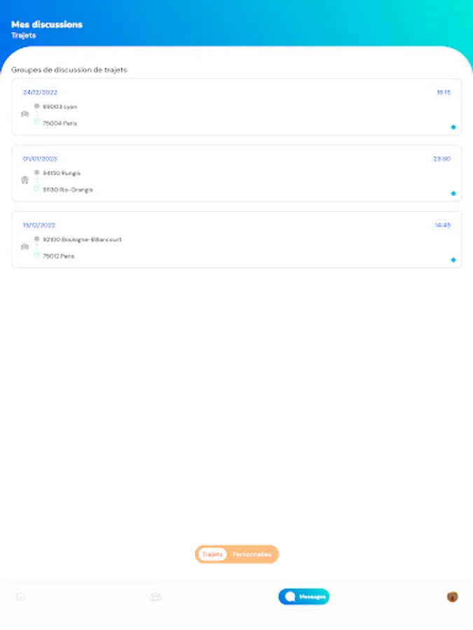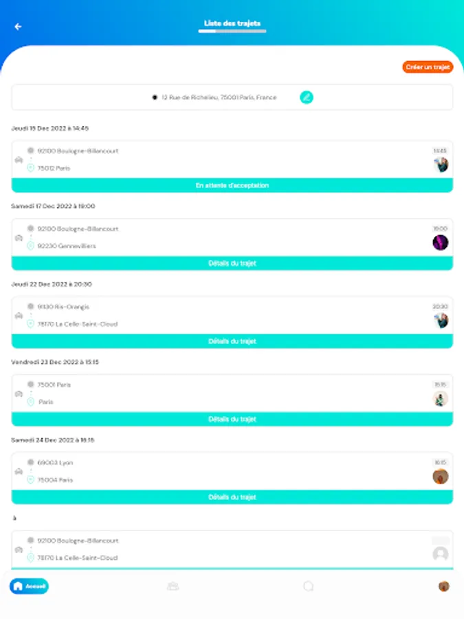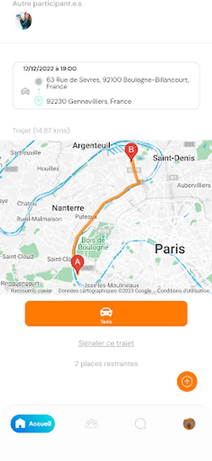 For example: You are in Paris this Thursday evening at 11:00 p.m. and want to find other people to share your trip to Boulogne-Billancourt.