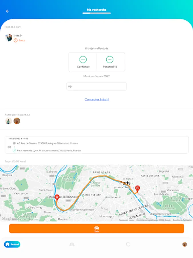 I am Inès, a woman who adores Paris and the wonders it offers. I regularly take public transport to go out. And one evening in 2021, I was heading to the train station to join my friends in Paris and as always, I was thinking about my return. It was at that exact moment that I said to myself: If only there was an app to get in with other people. Two weeks later, the adventure began!