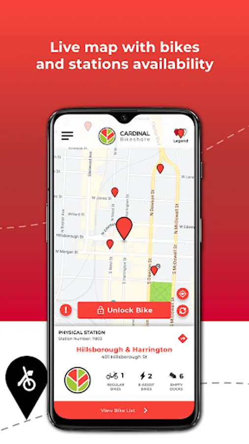 The Cardinal Bikeshare App is your ultimate tool to bike around Raleigh. Use the App to check bike availability at each station as well as your profile and previous routes. You can even unlock a bike!