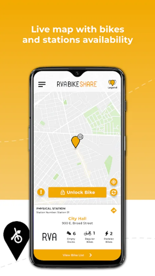 The official RVA Bike Share App is your ultimate tool to bike around Richmond. Use the App to check bike availability at each station as well as your profile and previous routes. You can even unlock a bike!