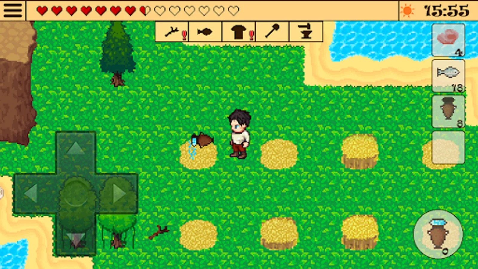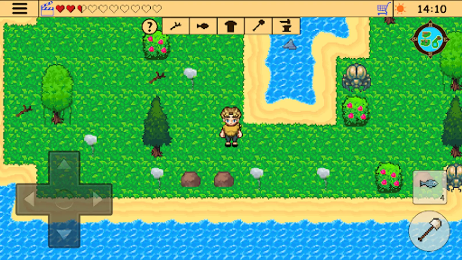 In order to survive and escape the deserted lost island, the hero will have to explore desert islands and dungeons, become a forager expert and gather items, craft multiple new ones and fight monsters in this fantasy retro pixel art 2d adventure.