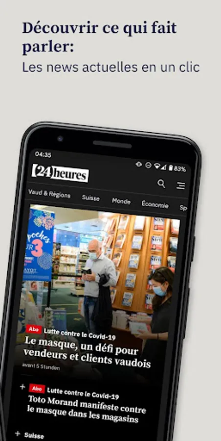 Avec l'application de 24 heures, nous vous accompagnons dans vos choix, nous thématisons ce qui vous motive, vous agace, vous inspire, vous habite. Nous parlons de la vie et des gens d’ici. Nous pratiquons un journalisme indépendant, précis, utile, éclairant, créatif, ludique et constructif. Nous accordons une place centrale aux enquêtes, ici et ailleurs, à l'incarnation sur le terrain du processus citoyen et de ce qui fait vivre tout le canton. Nous sentons battre le cœur du pays de Vaud, en Suisse et dans le monde.