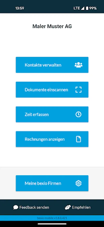 What do you think of our new app? Let us know by tapping the "Feedback" button in the bexioGo app. The button is in the dark blue area on the start page of the app.