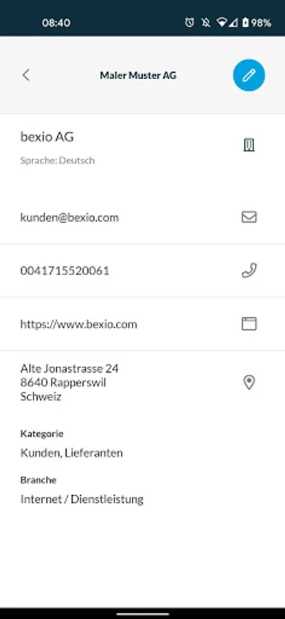 * Manage contacts on the go: Create, edit and contact your bexio contacts directly in the app (by call, e-mail or SMS) or view additional information such as location, website, comments, etc.