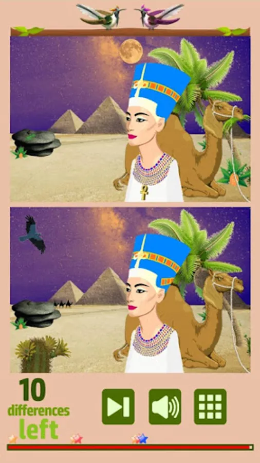 The aim of difference puzzle game is to find differences between two very similar images. If you like puzzle games, if you enjoy playing spot the difference games, you will love our free Find 10 Difference game as there are lots of hidden objects and animals to be found. There are color, shape and etc. differences in our game (which includes forest, lake, desert, sea etc. backgrounds).