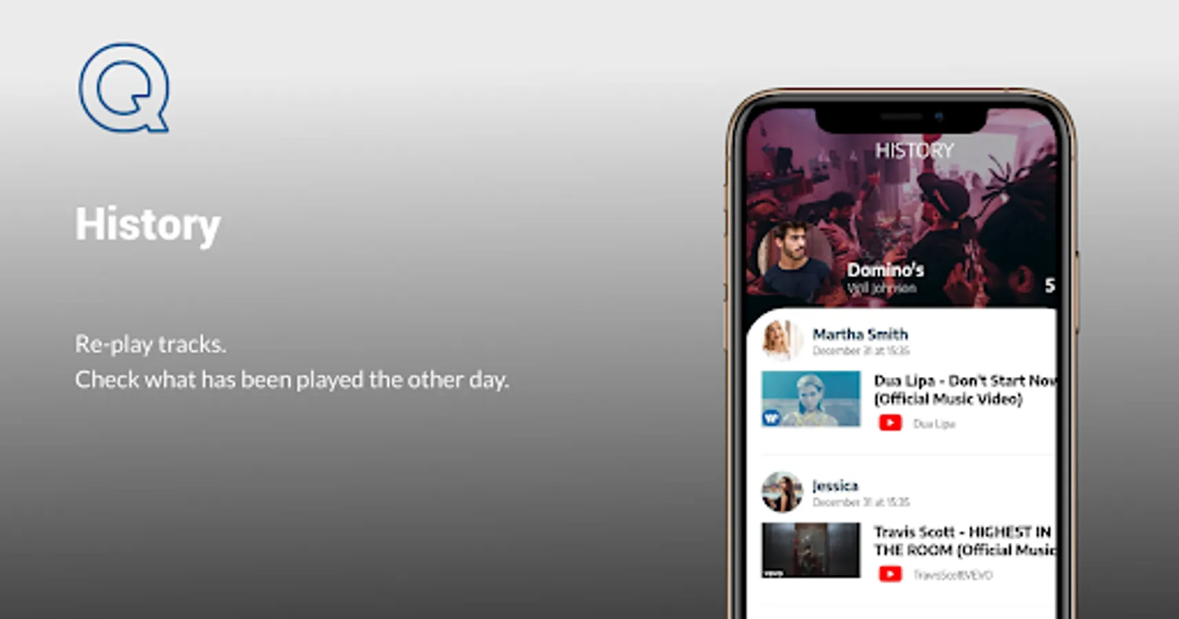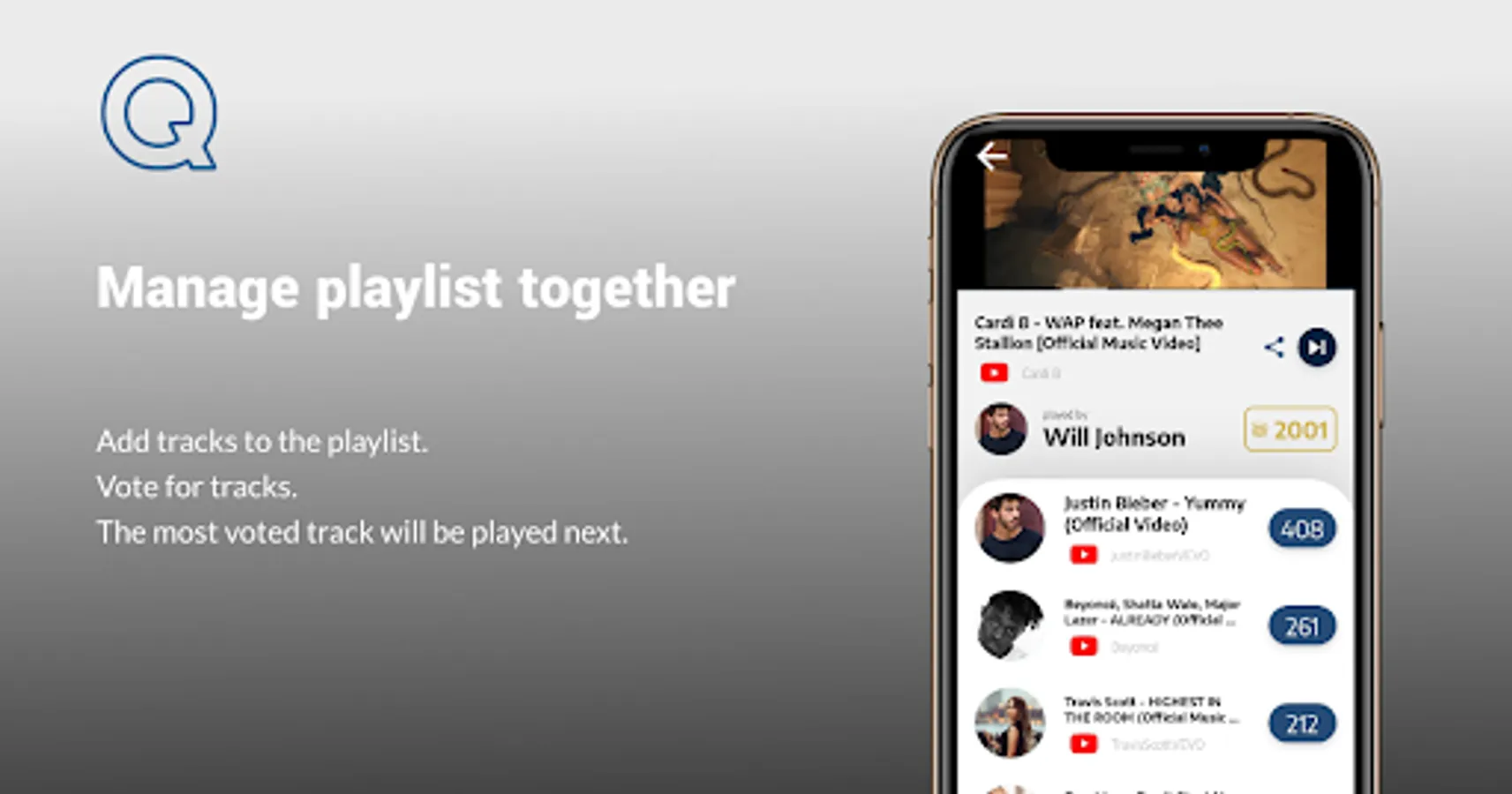 As we share space together we share sound too. Let's share it with The Q. Make party yours. Add your favourite music and videos to The Q. Show everybody what's your style and vote for media other people add. From now on everybody is in power to manage playlist being played at the party. You too.