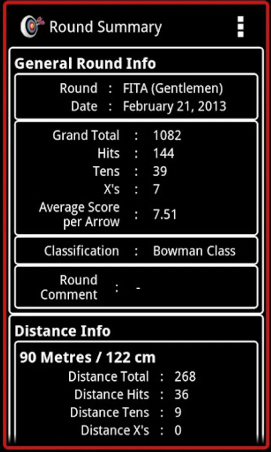 - Best Distance Summaty. Shows the best score you got for each distance of a Round. Can see what is your best 3 dozen at 90m etc