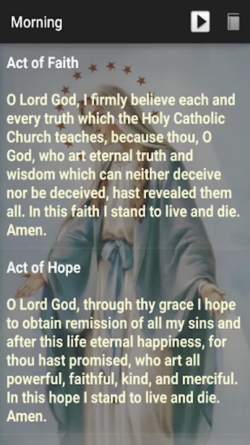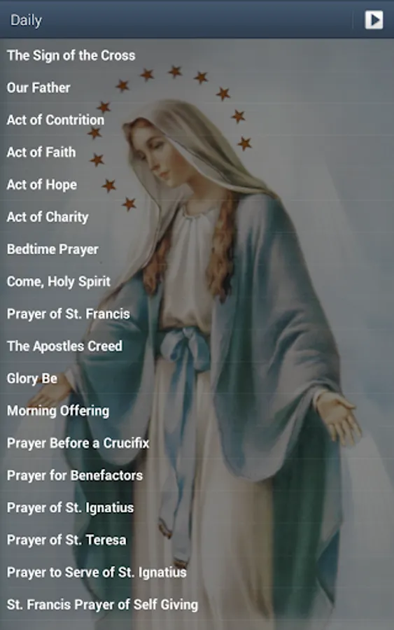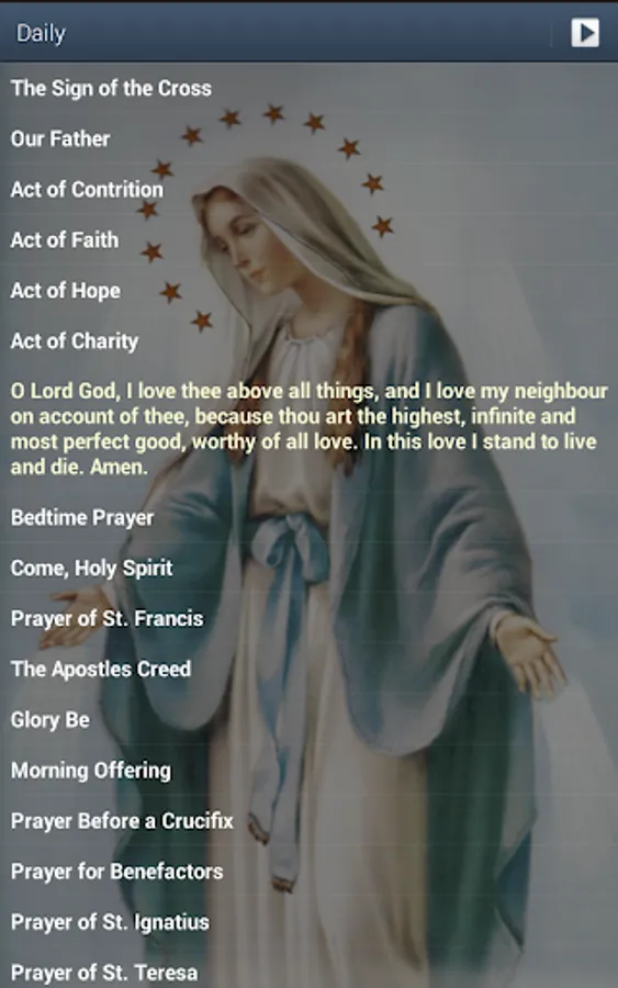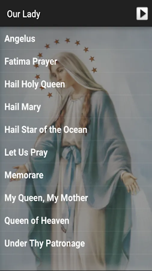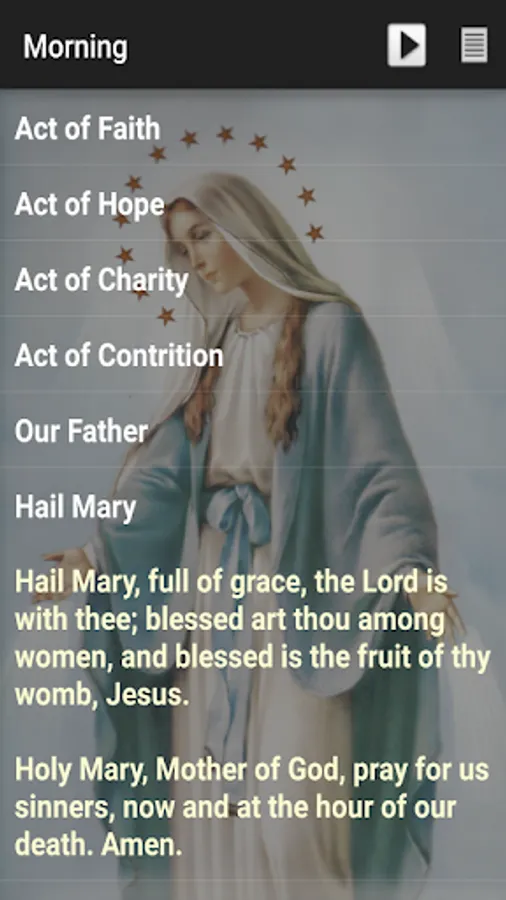 Tap the play icon to listen to the prayers. The first prayer in the list will begin. Tap a prayer in the list to jump to a particular prayer. Tap the pause icon to pause, or simply leave the audio playing, it will stop at the end of the list.