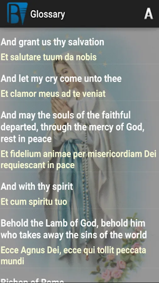 Many prayers have a Latin translation, and there is a helpful glossary of common Latin phrases.